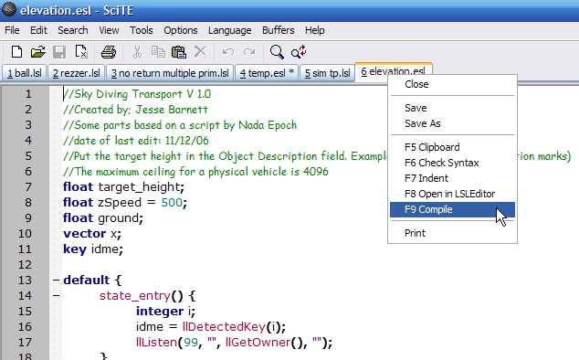 Many parts of this page will sound like an advertisement. SciTE is free, so no, I am not making any money off of this. It is just that SciTE has been sorely neglected for more then a year now. Ezhar Fairlight(Bless Him!!) brought us the original SciTE package for LSL, still functional but no longer maintained. Hopefully now others will start to play around with it.